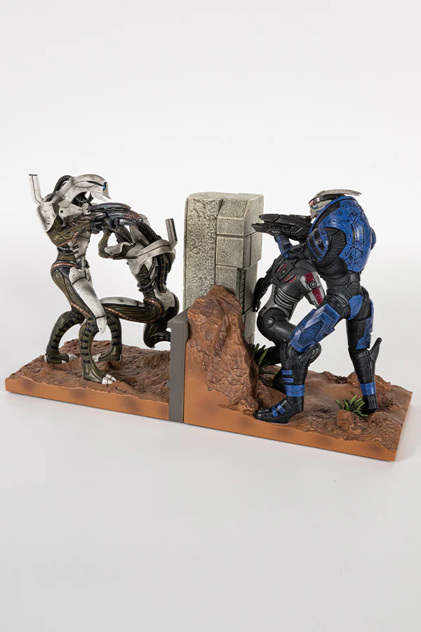 Shepard and Garrus are in a firefight against the geth. Their battlefield? Your bookshelf! Beautiful and functional, the Mass Effect Cover Fire Bookends are made to be shown off. Which of your favorite books will fit between them?