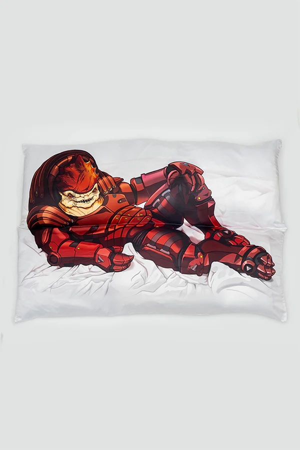 On one side, you'll find Wrex lying face up on a bedsheet, exuding all his rugged charm. He's looking at you with that fierce gaze, ready to protect the galaxy. When you're ready to switch things up, flip the pillowcase to reveal the krogan warrior lying face down, inviting you to join him in an epic slumber.